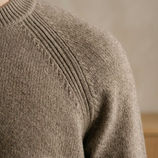 12-gauge Mongolian cashmere sweater with ribbed raglan sleeves. A second-skin layer of pure warmth.